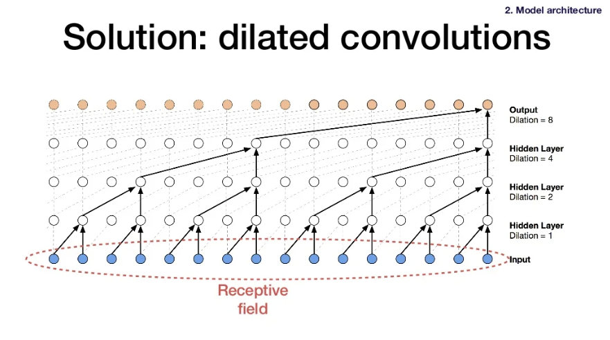 - Causal convolution: the entire window is from the past. You don't look at any future data layers to get the output.