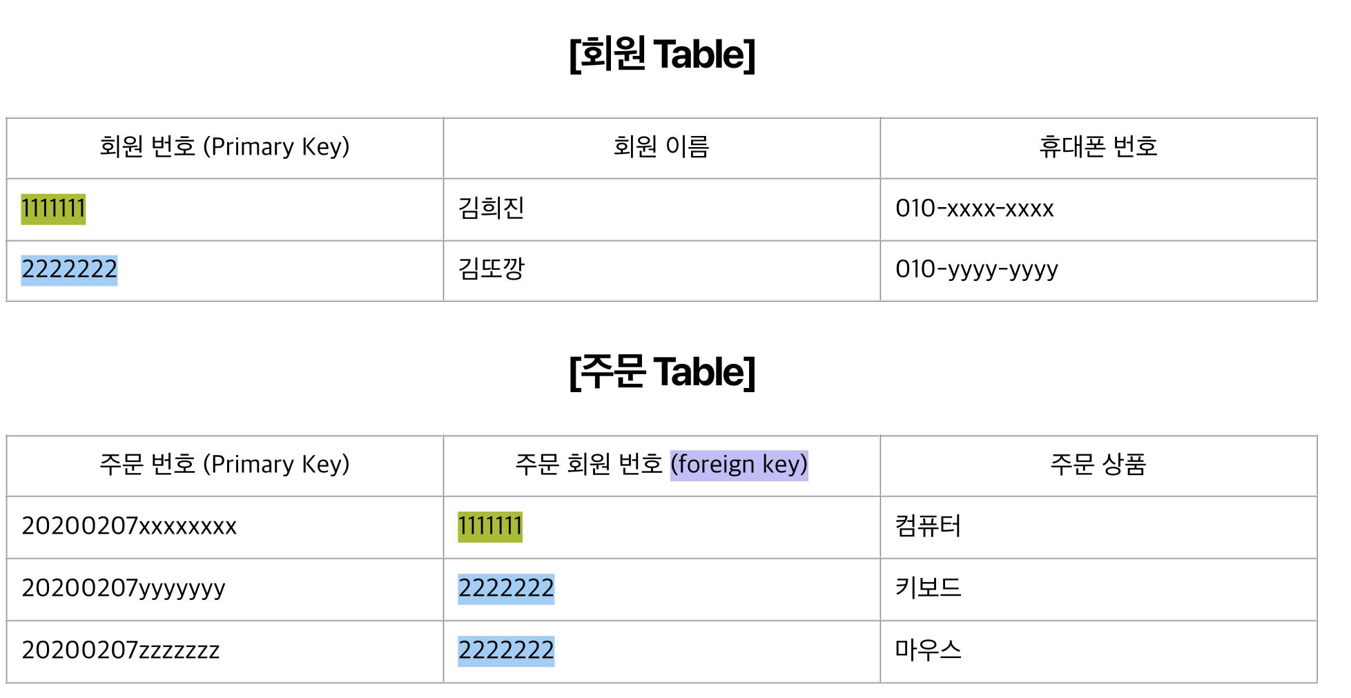 위의 예시의 경우에서는 회원 table의 기본키인 회원 번호를 주문 table에서 주문 회원 번호로 참조를 하는 경우이다.