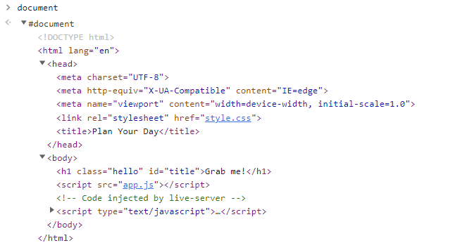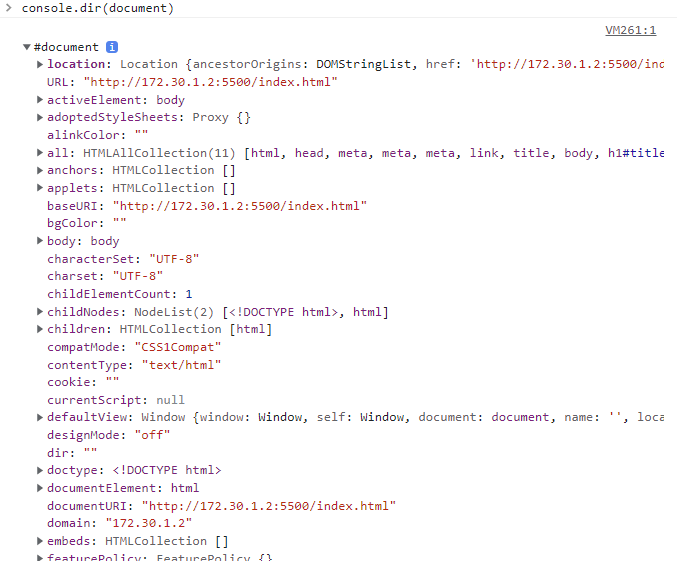 console에 document를 입력하면 작성한 HTML을 가져올 수 있다.